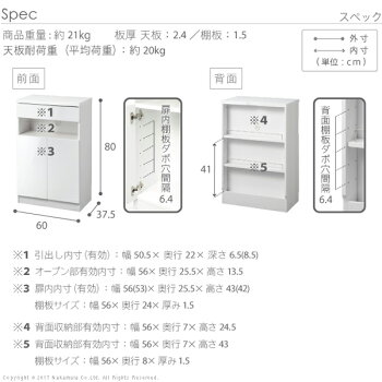 【仕様】本体:プリント紙化粧パーティクルボード前面:合成樹脂化粧繊維板引出し:スライドレール付◎組立式【サイズ】本体:幅60x奥行37.5x高さ80cm重量:約21kg引出内寸(有効):幅50.5x奥行22x高さ6.5(8.5)cmオープン部有効内寸:幅56x奥行25.5x高さ13.5cm扉内内寸(間口):幅56(53)x奥行25.5x高さ43(42)cm棚板サイズ:幅56x奥行24cm・厚み15mmダボピッチ(扉内・背面):下から8cm、6.4cmピッチで5穴背面収納部有効内寸(上段):幅56x奥行7x高さ24.5cm背面収納部有効内寸(下段):幅56x奥行7x高さ43cm(間口高さ41cm)背面収納部棚板サイズ:幅56x奥行8cm・厚み15mm天板配線カット:12x1.5cm幅木カット:12x1cm株式会社ナカムラ(F0800453)【納期目安】メーカーより直送/翌営業日から5営業日出荷※メーカー在庫での対応となります。